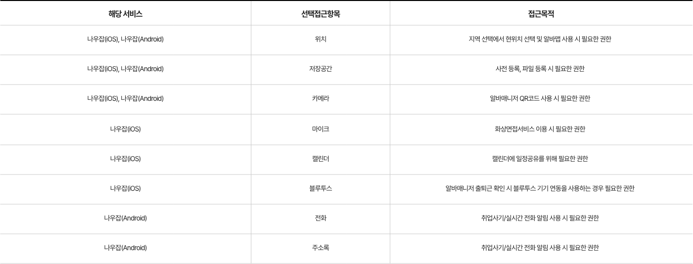 1) 회사는 현재위치 근방 채용정보 표시를 위하여 개인위치정보를 서비스를 제공하나 개인위치정보를 일회성 또는 임시로 이용하며, 저장하거나 보유하지 않습니다
